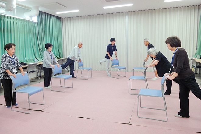 - 短期集中が終了した方を対象とした運動教室で、理学療法士とシルバーリハビリ体操指導士の方と協力しながら月に1回行っています。